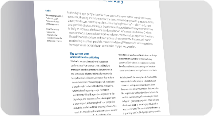 Allianz Global Investors Center for Behavioral Finance onRisks The neglected variable affecting portfolio February 2016 choices in the 21st century Author In the digital age, people have far more access than ever before to their investment Shlomo Benartzi, Ph.D. accounts, allowing them to monitor the latest market changes with great ease. In this Professor, UCLA paper, we discuss how this variable—“monitoring frequency”— affects judgment Anderson School and portfolio choices. We argue that the ease of portfolio monitoring on smartphones of Management Chief Behavioral is likely to increase a behavioral tendency known as “myopic loss aversion,” where Economist, investors focus too much on short-term losses. We then ask an important question: Allianz Global Should financial advisors and plan sponsors incorporate the frequency of market Investors Center for monitoring into their portfolio recommendations? We conclude with suggestions Behavioral Finance for ways to use digital design to minimize myopic loss aversion. The current state we will look at how financial institutions can design of investment monitoring investment products that fit the monitoring We live in an age obsessed with investment patterns of their clients. In addition, we examine performance. Plan sponsors hire and fire fund how financial institutions can improve how they managers based on the returns they achieved in communicate investment performance to clients. the last couple of years. Individuals, meanwhile, keep close track of how much money they make or Let’s begin with the survey data. In October 2015, lose in the market. This white paper will investigate we commissioned a survey of 1,050 adults with a largely neglected variable of all this monitoring, retirement savings accounts and asked them which is how frequently people check their how, and how often, they checked their portfolios. investments. We will argue that, especially in the Not surprisingly, we found a wide variation in the digital age, the frequency of monitoring can have method and frequency of monitoring. As shown a large impact, influencing both how people feel in Figure 1 (see next page), while 15% of subjects about the market and their ensuing behavior. As a check once a year or less, roughly 20% check at result, it’s crucial that financial institutions monitor least once a week. The most common frequency the monitoring done by their clients. After is quarterly, with 34.5% of people getting updates reviewing new survey data on investment tracking, every few months. befi.allianzgi.com