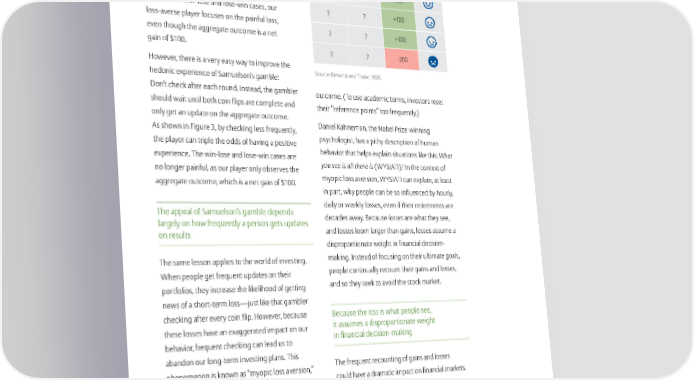 The neglected variable affecting portfolio choices in the 21st century possible outcomes on the two coin flips: A player Figure 3: Possible hedonic outcomes if investors do can either win-win, win-lose, lose-win, or lose-lose. not check after each round Unfortunately, given the impact of loss aversion, a player who checks the results after each round First Second Hedonic Round Round Total Experience would only experience a positive hedonic ? ? +400 experience in one of the four scenarios. The reason is that in the win-lose and lose-win cases, our ? ? +100 loss-averse player focuses on the painful loss, even though the aggregate outcome is a net ? ? +100 gain of $100. ? ? -200 However, there is a very easy way to improve the hedonic experience of Samuelson’s gamble: Source: Benartzi and Thaler, 1995. Don’t check after each round. Instead, the gambler outcome. (To use academic terms, investors reset should wait until both coin flips are complete and their “reference points” too frequently.) only get an update on the aggregate outcome. As shown in Figure 3, by checking less frequently, Daniel Kahneman, the Nobel Prize-winning the player can triple the odds of having a positive psychologist, has a pithy description of human experience. The win-lose and lose-win cases are behavior that helps explain situations like this: What 5 no longer painful, as our player only observes the you see is all there is (WYSIATI). In the context of aggregate outcome, which is a net gain of $100. myopic loss aversion, WYSIATI can explain, at least in part, why people can be so influenced by hourly, The appeal of Samuelson’s gamble depends daily or weekly losses, even if their retirements are largely on how frequently a person gets updates decades away. Because losses are what they see, on results and losses loom larger than gains, losses assume a disproportionate weight in financial decision- The same lesson applies to the world of investing. making. Instead of focusing on their ultimate goals, When people get frequent updates on their people continually recount their gains and losses, portfolios, they increase the likelihood of getting and so they seek to avoid the stock market. news of a short-term loss—just like that gambler checking after every coin flip. However, because Because the loss is what people see, these losses have an exaggerated impact on our it assumes a disproportionate weight behavior, frequent checking can lead us to in financial decision-making abandon our long-term investing plans. This phenomenon is known as “myopic loss aversion,” The frequent recounting of gains and losses and it results from a mismatch between the time could have a dramatic impact on financial markets. horizon of an investment and the frequency of In our original paper on myopic loss aversion, our account evaluations. In general, the greater my colleague Richard Thaler and I explored the the mismatch, the more likely we are to overreact relationship between monitoring frequency and 6 to short-term losses, counting our recent gains the equity risk premium. As shown in Figure 4, if and losses instead of staying focused on the final investors were able to focus on 20-year returns,
