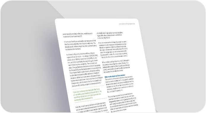 Econs, humans and the perception of risk automatically enrolled in the plan, would you pick of … individuals managing large corporate plans. „nvestment Œ or „nvestment œ˜ Œgain, ‰ ¡ selected „nvestment Œ and ¡ felt Œ was less risky than œ. „t turns out that if you use traditional measures of risk that focus on variability, the choice is really easy” «ou ¬ow can we reconcile the huge disconnect between should pick œ. •hile it might be a bit counterintuitive, common industry measures of risk and the fact that let’s look at the numbers. ¡ of plan sponsors think „nvestment œ is actually the riskier investment˜ •e recently asked the š„O of Œs shown in Figure §, „nvestment œ has a higher one of the mega plans we interviewed why he felt epected rate of return—it is almost .ƒ¡ ¨ .£¡© „nvestment œ is riskier. ¬is answer was very telling” versus about ¡ for investment Œ ¨.¡©. „n addi “•e don’t define risk in standard deviation terms.” tion, and this is probably the surprising part, „nvest ment œ also has less variability. Žhe numbers are •hen we kept asking what risk is, the š„O thought it clear” Žhe gap between the best and worst outcomes was pretty obvious that risk is about “losing.” Œs a for œ is ¥ust Š¡, but for „nvestment Œ it is actually ¡. behavioral economist ¨hlomo© and a psychologist Žhis means that œ is safer than Œ, at least according ¨™ohn©, we are not surprised that plan sponsors are to calculations based on the variance or standard lossaverse. •e are also lossaverse. deviation of the two investments. œecause œ has a higher return and lower risk, it also has a much higher What to do aout our loss a‚ersion harpe ratio, which means that by most traditional Žhe “uestion, of course, is what should we do about measures œ is simply a superior investment to Œ. our lossaverse tendencies˜ „n the spirit of a publisher that recently asked us to write a book about rewiring „f you use traditional risk measures that focus our brain to cure all our bad money habits ¨in a few on variability, you should pick „nvestment œ. «et, minutes©, should we rewire our brains to eliminate most financial advisors and plan sponsors we loss aversion˜ Obviously not. surveyed picked „nvestment Œ. First, we have no idea how to rewire the brain ¨nor how to write that book©. econd, and more Œnd yet, most financial advisors and plan sponsors importantly, there is nothing fundamentally wrong we surveyed selected „nvestment Œ and felt that œ with being loss averse. œut, and this is a big “but,” was riskier, not safer. „n our sample of advisors, …¡ if we accept loss aversion as part of human nature, selected Œ, and §¡ felt Œ was less risky. Our sample then we have to ensure that our investment strategy of plan sponsors, which is admittedly small, consisted fits how we feel about losses. Figure §” o financial ad‚isors ercei‚e ris Investment A Investment B ›ikely outcome ¨happens ¡ of the time© ¡ ¡ Unlikely outcome ¨happens ¡ of the time© ¡ ƒ ¡ Epected rate of return .¡ .£¡ ‡ange of outcomes ¡ Š¡ tandard deviation . ƒ¡ Š. †¡ harpe ratio . .† „nvestment preferred …¡ ‰¡ „nvestment that felt riskier Š¡ §¡ ource for standard deviation and harpe ratio calculations” risklab.