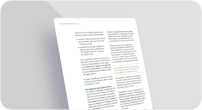 Econs, humans and the perception of risk Žo help us žoom in on the psychology of risk, we’d amuelson’s colleague offered the following reason like you to consider two hypothetical investments” for re¥ecting the bet” “„ won’t bet because „ would feel ◾ „nvestment Œ almost always provides a ¡ return the ¤ loss more than the ¤… gain.” „f you also per year, but there is also a small chance of ¡ re¥ected the bet, you probably felt the same way to double your money. For the human mind, losses loom larger than gains. ◾ „nvestment œ almost always provides an ¡ „n their seminal work, ¢obel ›aureate aniel return, but again, there is a small chance of ¦ahneman and his longtime collaborator Œmos ¡ for things to be different, in this case to Žversky estimated that, on average, losses loom lose half your money. § about two to two and a half times larger than gains. ¨„n technical terms, the average “loss aversion Œssuming an investment horižon of one year, which coefficient” is about two to two and a half.© Žhus, investment, Œ or œ, feels riskier to you˜ •e will discuss whenever the upside is “only” twice the downside, this “uestion in detail a bit later, but here’s a “uick as in amuelson’s bet, many people decline the bet.ƒ preview” ‹ost industry measures of risk suggest that „nvestment œ is actually safer than Œ. „n other words, ›osses loom about …–….ƒ times larger than gains— the one that might lead you to lose half your money which could cause people to re¥ect a prospect with is the safer investment. an unusually high return and not much to lose. Žhis paper is about the gap between what “humans” perceive to be risky and how risk is often measured „n principle, there is nothing wrong with being loss by economists, or “econs.”… averse. „t is important, however, that when we navi gate our uncertain world, we take into account our The asymmetric nature of gains and losses asymmetric sensitivity to losses and understand First, though, it’s worth “uickly reviewing some of the how it might impact our choices. academic literature on the nature of risk, which has been the focus of many economists and psycholo Žo highlight the influence of loss aversion, let’s con gists. ‹ore than half a century ago, ¢obel ›aureate sider three pairs of gambles. Žhe three pairs are dis ‚aul amuelson offered one of his ‹„Ž colleagues a played in Figure … ¨see the net page©. Žaking the first £ bet on a coin during lunch. Žhe upside was winning pair as an eample, ‘amble has e“ual chances of ¤… and the downside was losing ¤ . •ould you losing ¤ , breaking even ¨that is, neither winning accept this gamble for real money right now˜ nor losing© and winning ¤ ‘amble … also has e“ual chances of losing ¤£ , breaking even or „f you’re like amuelson’s colleague, you re¥ected the winning ¤£ . bet. „n fact, most people re¥ect the bet. œut why˜ „f you think of it as investing ¤ , then you either get Žhe “uestion, then, is for each of the three pairs in nothing back or ¤£ back, yielding an average win Figure …, would you pick ‘amble or ‘amble …˜ of ¤ƒ . „n terms of rates of return, this “investment” Œlso, which gamble feels riskier˜ provides an epected return of ƒ ¡ in no time, with a worst case scenario that costs about as much as a nice dinner. ‚ut differently, most people re¥ect an investment with an unusually high return and not much to lose.